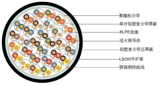 铝塑复合屏蔽,每对屏蔽金属面向内,紧挨0.5mm²的排流线 |